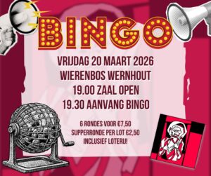 Vrijdag 20 maart is het zover. Dan staat de jaarlijkse bingo weer op de planning. De deuren van Het Wierenbos zullen om 19.00 openen waarna we om 19.30 beginnen. Zoals jullie gewend zijn zullen we 6 rondes doen waarbij er in elke ronde 3 prijzen te winnen vallen. Tussendoor hebben we een kinderronde waar de kids die op de basisschool zitten gratis aan mee mogen doen. Aan het eind hebben we nog de welbekende superronde met fantastische prijzen!