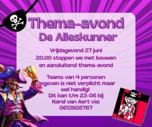 Het is vrijdag 27 juni weer tijd voor de eerste thema avond van 2025🍻! Na het succes van vorig jaar komt er een tweede versie van De Alleskunner, deze keer in teams. We willen dit graag binnen eigen buurt testen om het volgend jaar mogelijk op te zetten als een groter evenement, ook voor andere buurtschappen. Om dit goed te kunnen doen en iedereen de mogelijkheid te geven om mee te doen, stoppen we deze avond om 20:00 met bouwen. We zouden graag minimaal 8 teams van 4 personen hebben om de opzet te testen. dus geef je teamleden en teamnaam door aan Karel!